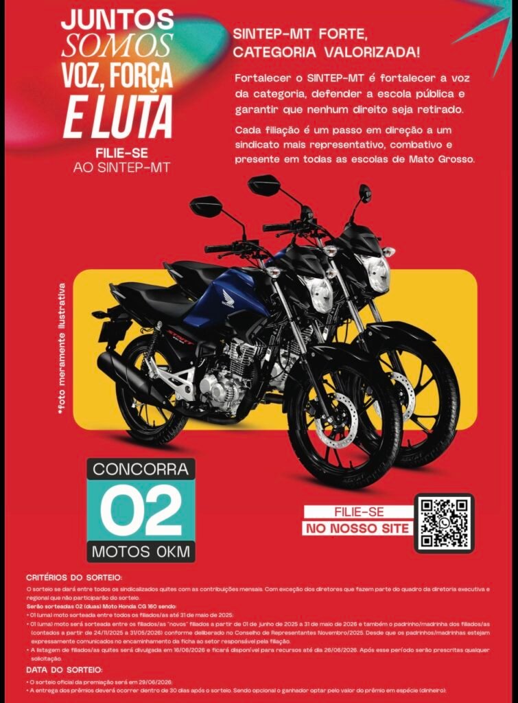 Para celebrar o crescimento da categoria, o SINTEP-MT lançou uma grande campanha de filiação com o sorteio de duas motos Honda CG 160 0km (ou o valor em dinheiro) para os sindicalizados quites com as contribuições: